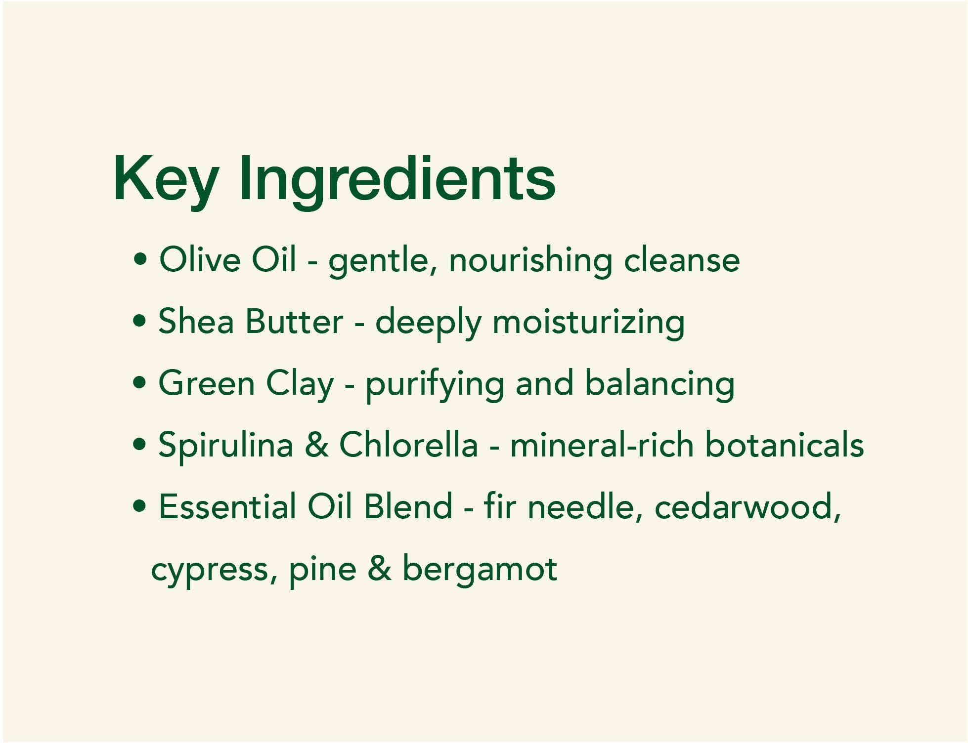Olive Oil*, Raw Coconut Oil*, Sustainable Palm Oil*, Raw Shea Butter*, Distilled Water, Sodium Hydroxide, Spirulina Powder, Chlorella Powder, Green Clay, Fir Needle, Cedarwood, Cypress, Pine and Bergamot Essential Oils.